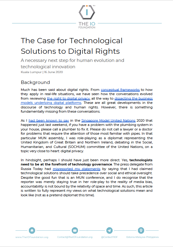 What does it mean when technologists say “you can code anything”? In her inaugural article for The IO Foundation, Maryam Lee shares her thoughts on why human rights perspectives have the potential to move technological innovation to greater heights. She also argues that people do not need to choose between enjoying the latest technologies and human rights, and how they both could co-exist in our lives.